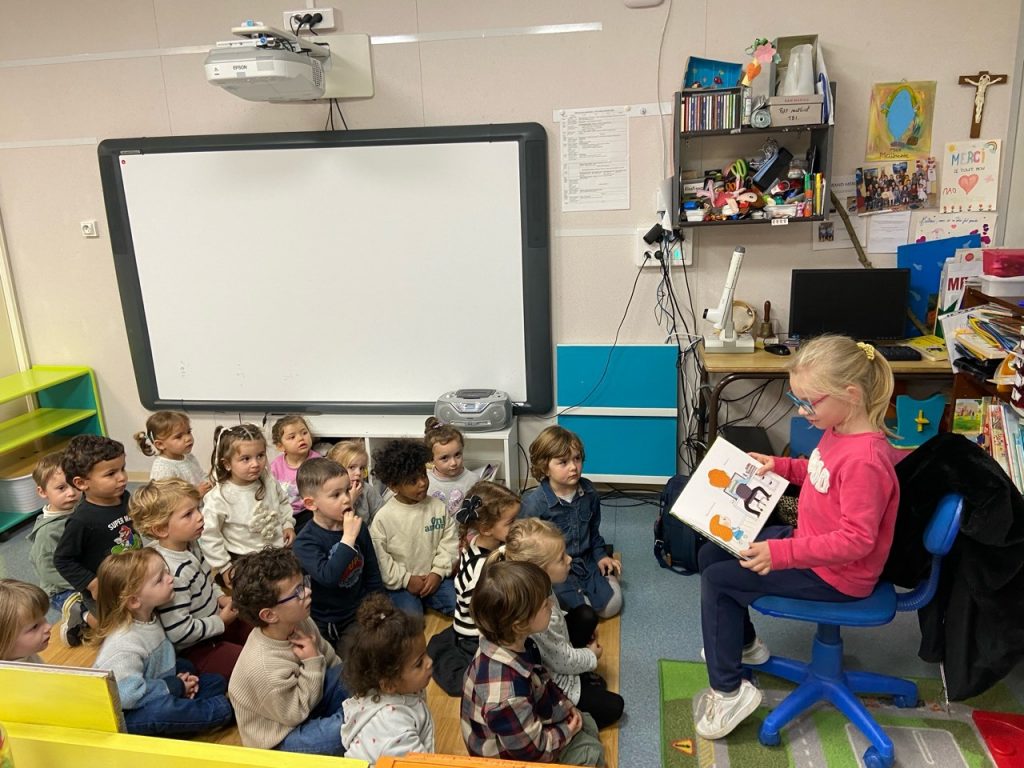 Ninon, élève en CE1 a gagné un privilège grâce à son super travail effectué en classe, elle a choisi de venir lire une histoire aux élèves de TPS-PS