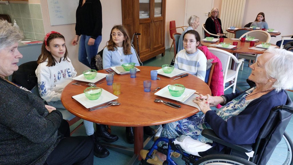 Jeudi 5 février, le projet avec l’Ehpad Madeleine Lamy a évolué. Jusqu’alors, les enfants mangeaient dans une salle à part, ce jeudi, 5 enfants ont mangé à la table des résidents pendant que 5 résidents mangeaient à la table des enfants. Ca a été un beau moment de partage, apprécié de tous, petits et grands, qui sera reproduit tous les jeudis dorénavant.